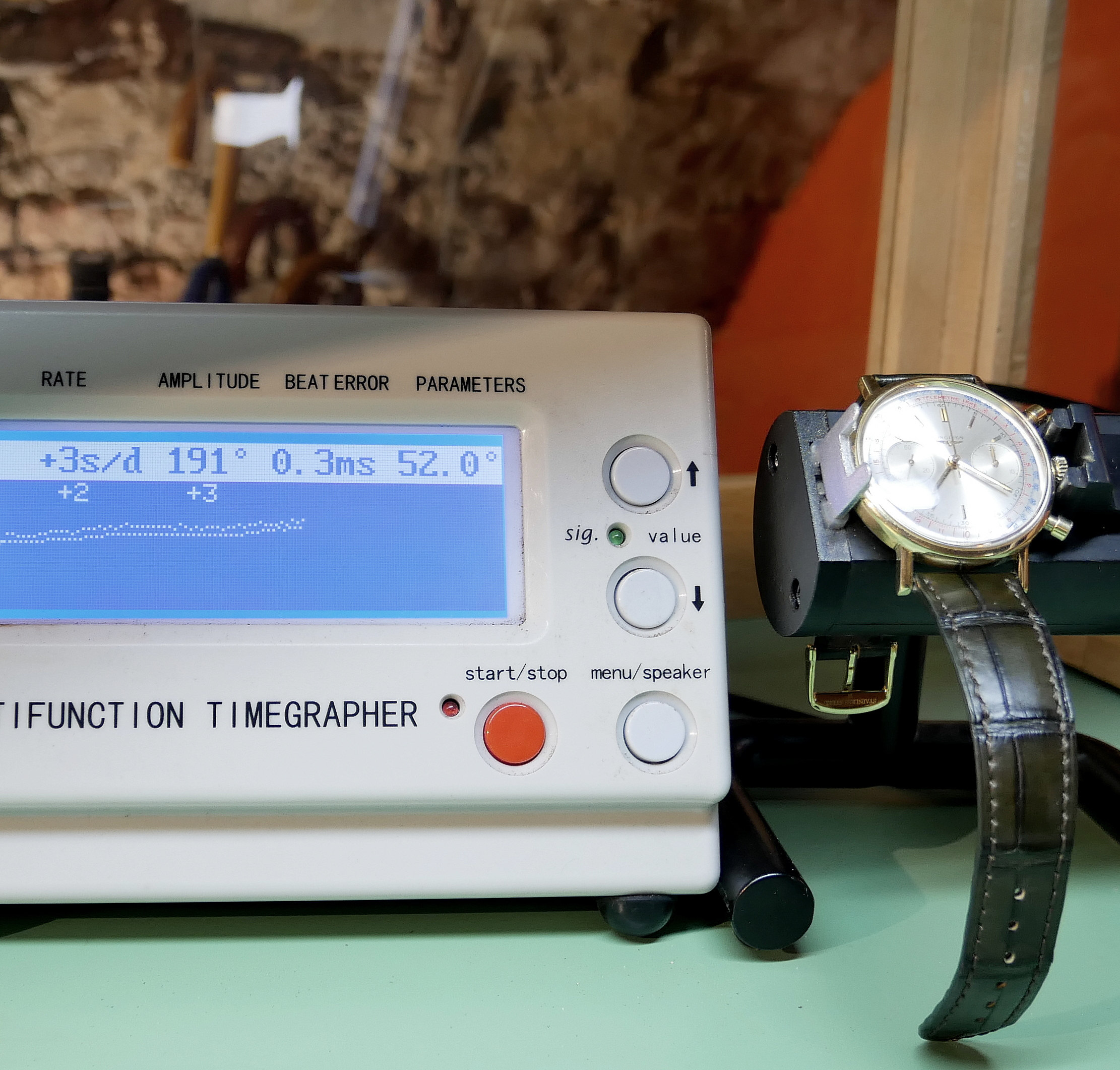 • MOVEMENT: Manual winding, function: hours, minutes, second and chronograph with two counters.