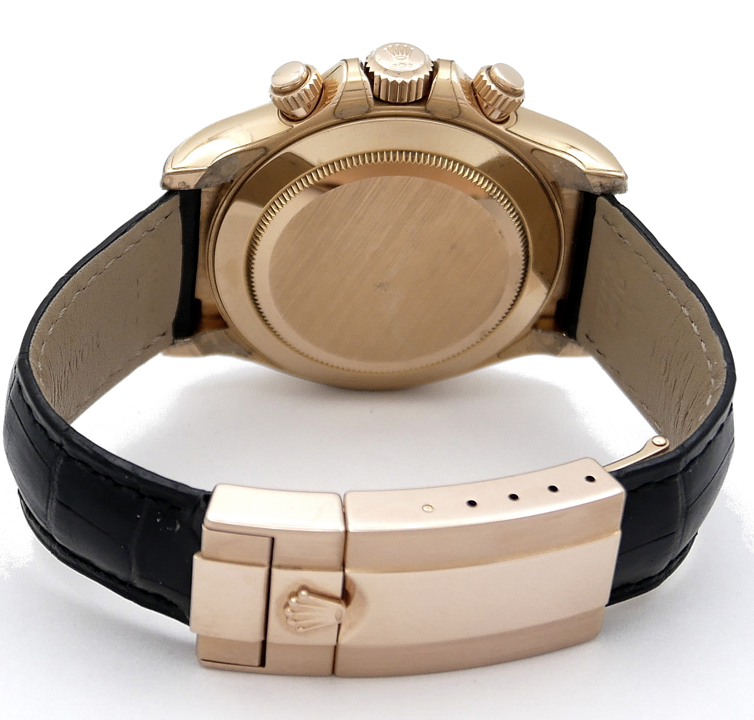 • BRACCIALE: Coccodrillo nero con chiusura deplo in oro rosa.