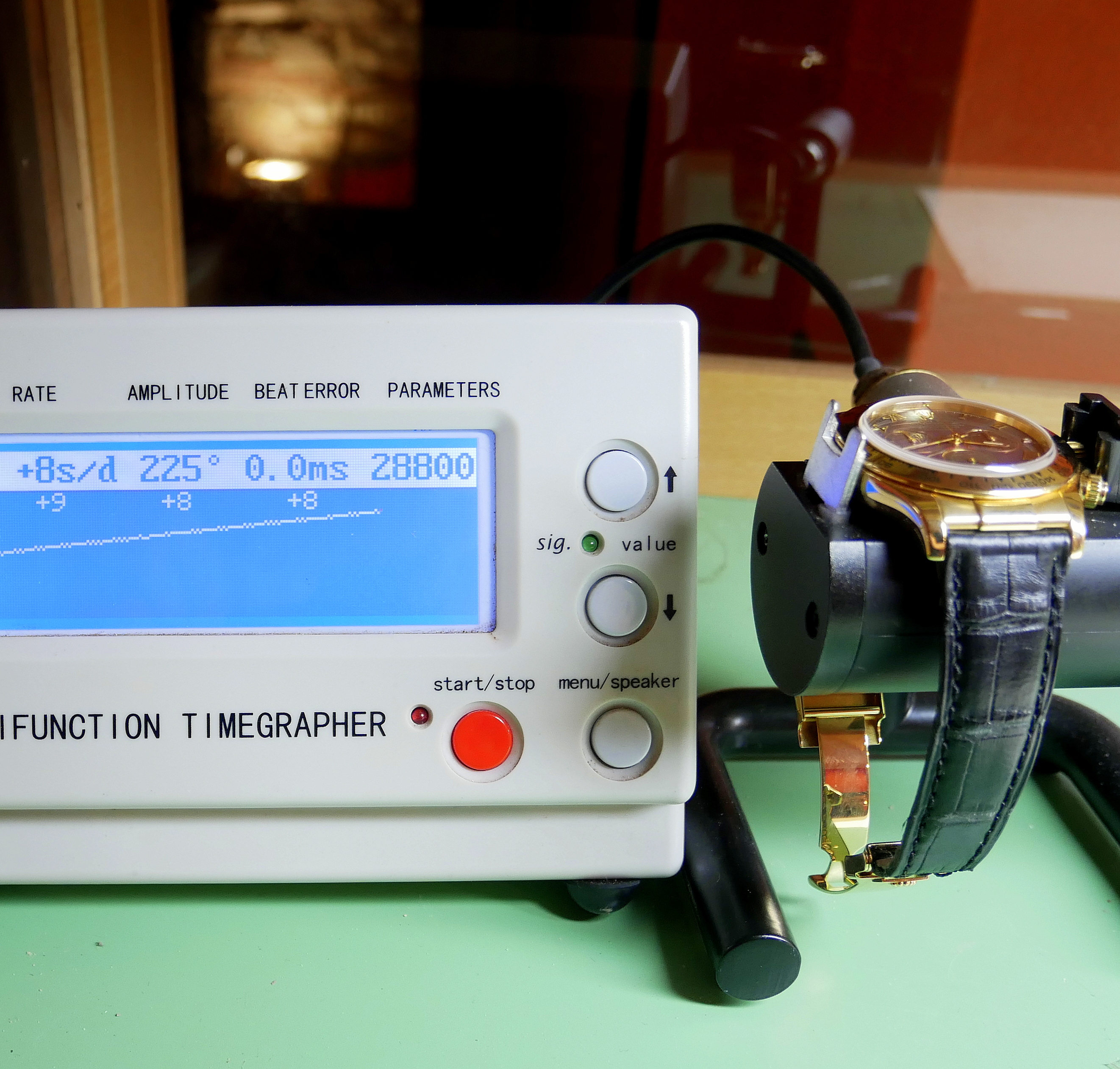 • CASSA: Oro giallo, ghiera in oro con scala tachimetrica, vetro in zaffiro, corona e pulsanti a vite, impermeabile 10atm., diametro 40mm.