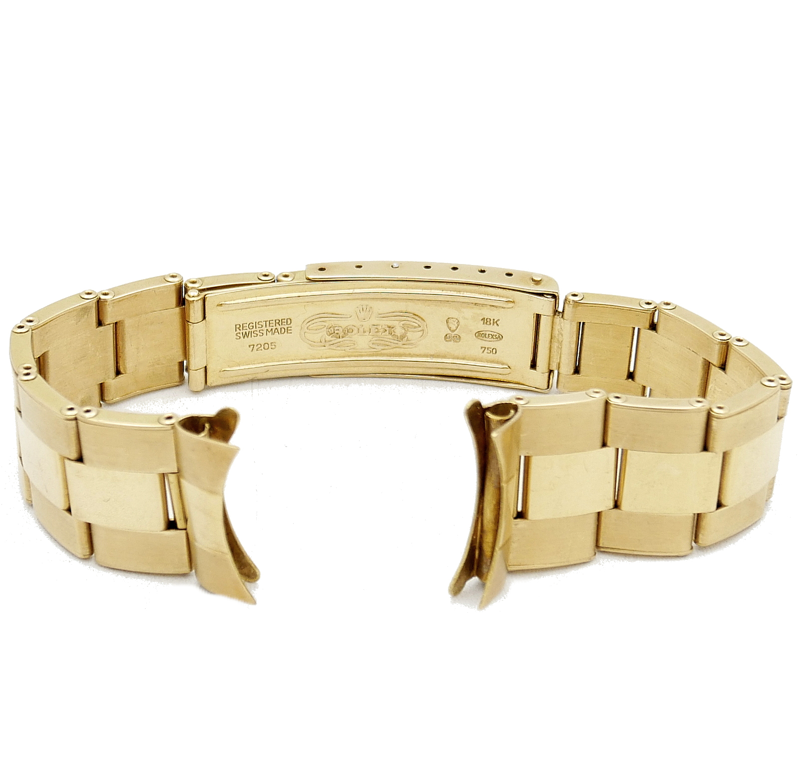 Bracciale Rolex Oyster Vintage ref. 7205 in oro 18Kt a maglie rivettate lucido/satinate per orologio Date Just con copriansa n° 57 da 19mm. Con un totale di 13 maglie più coprianse misura 17,5cm di lunghezza, in ottime condizioni.